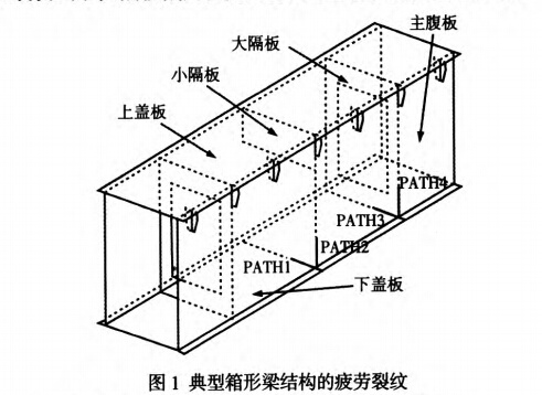 通過對(duì)在役橋門式起重機(jī)的實(shí)際檢測(cè)和疲勞試箱形梁結(jié)構(gòu)的高發(fā)性疲勞裂紋,主要發(fā)生在下蓋板與主腹板間的縱向受拉翼緣焊縫和大隔板與主腹板連接焊縫下端的焊趾處,其疲勞裂紋萌生源和擴(kuò)展機(jī)理,如表1所示。]