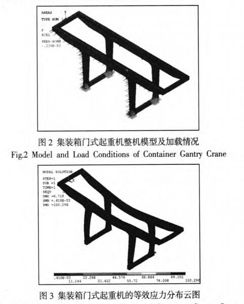 某鐵路局36t集裝箱門式起重機(jī)結(jié)構(gòu)主要參數(shù)為跨度18m,懸臂長12.5m,小車軸距8.6m。利用ANSYS及其參數(shù)化設(shè)計(jì)語言(APDL),采用sheU63單元,建立起重機(jī)整體結(jié)構(gòu)的參數(shù)化模型。將小車位于跨中,起升機(jī)構(gòu)滿載提升考慮沖擊載荷)時(shí),作為研究跨間裂紋的最危險(xiǎn)工況。同時(shí)考慮結(jié)構(gòu)自重、風(fēng)載、大車運(yùn)行偏斜側(cè)向力等的作用,起重機(jī)整機(jī)模型及此工況下的加載情況,如圖2所示。在跨中工況下,整機(jī)結(jié)構(gòu)的等效應(yīng)力云圖,如圖3所示。