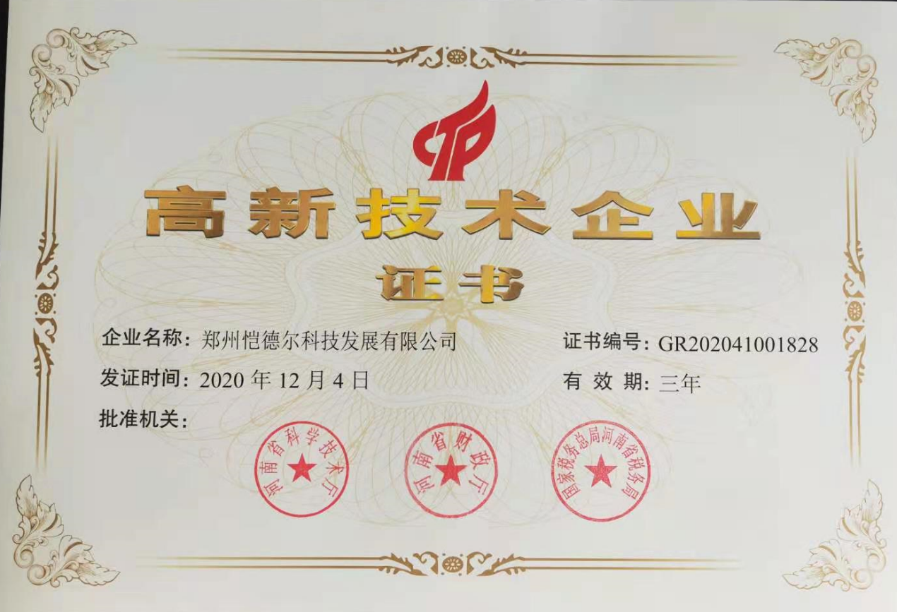 熱烈祝賀鄭州愷德爾科技發展有限公司通過高新技術企業認證